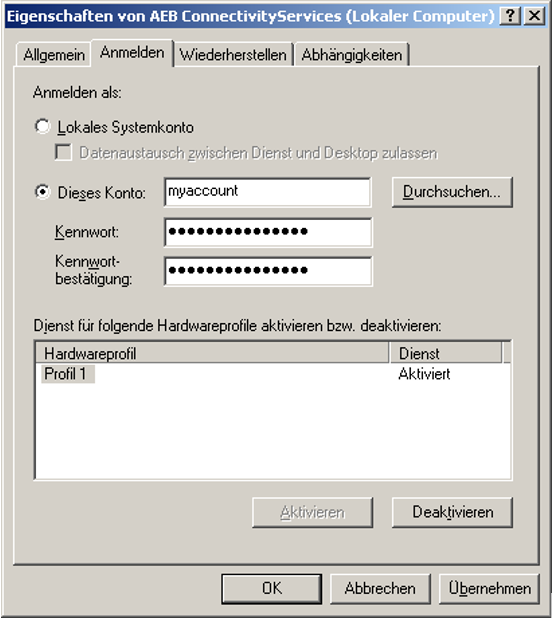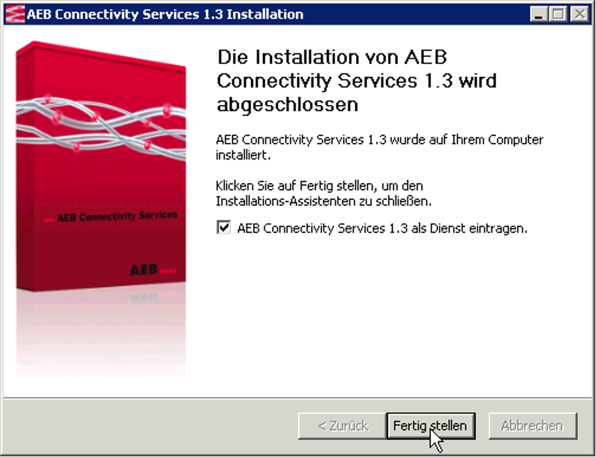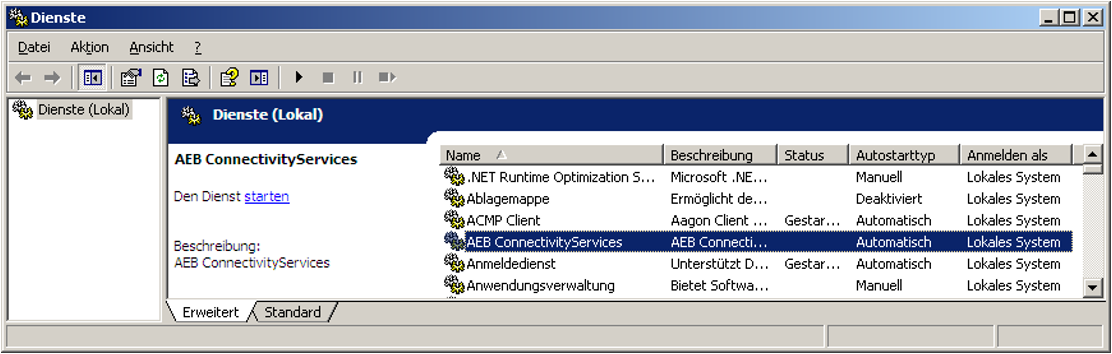 Wenn während der Installation die Option AEB Connectivity Services als Dienst eintragen gewählt wurde, wird automatisch ein Dienst AEB ConnectivityServices angelegt.