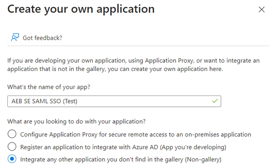 - Im Menü zu Enterprise applications wechseln und über New application eine neue Applikation anlegen. Anschließend über Create your own application einen Namen festlegen, den Menüpunkt „Integrate any other…“ wählen und auf Create klicken.