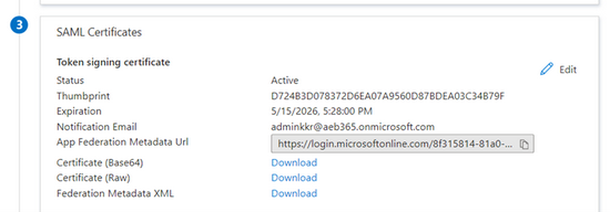 App Federation Metadata Url: zu finden in der Enterprise application unter Single Sign-On im Abschnitt „SAML Certificates“: