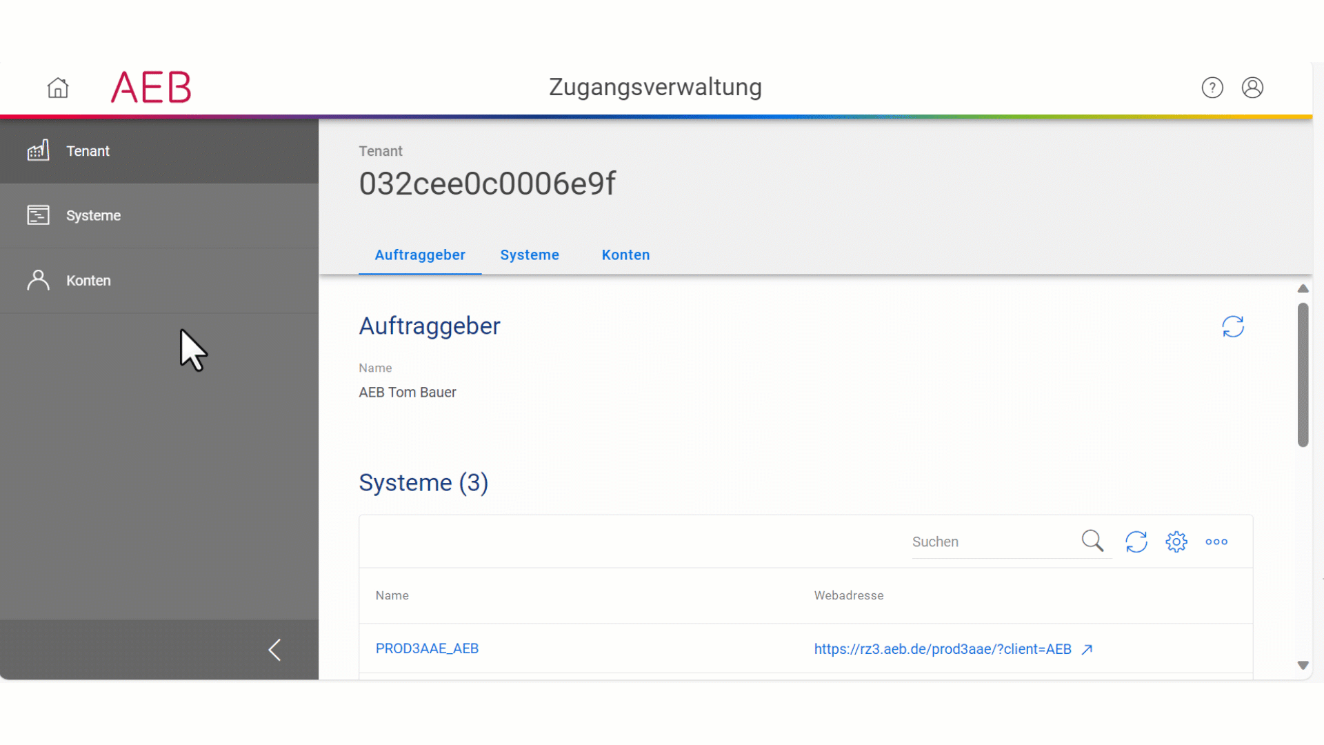Für jeden Tenant ist initial ein Tenant Admin hinterlegt. Zusätzlich können Sie die Rolle Tenant Admin entweder direkt bei der Anlage eines neuen AEB-Kontos oder nachträglich zu einem bestehenden AEB-Konto hinzufügen.