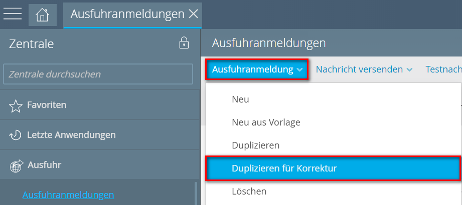 - Wählen Sie in der Menüzeile Ausfuhranmeldung den Eintrag Duplizieren für Korrektur.