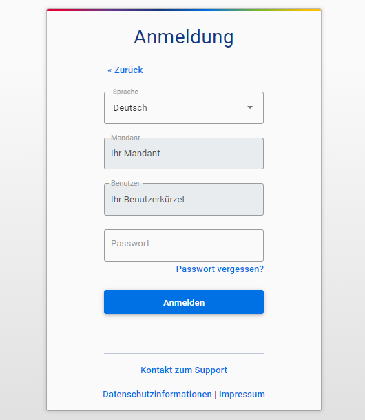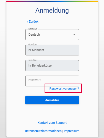 Der neue Benutzer kann sich nun anmelden. Zur Anmeldung kann er entweder das von Ihnen vergebene Passwort verwenden oder auf Passwort vergessen klicken, um sich in der Anwendung selbst ein neues Passwort zu vergeben.