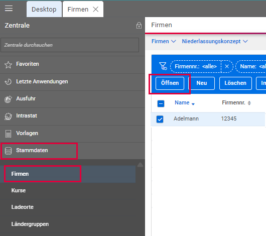 - Öffnen Sie Ihr Unternehmen unter Stammdaten - Firmen.