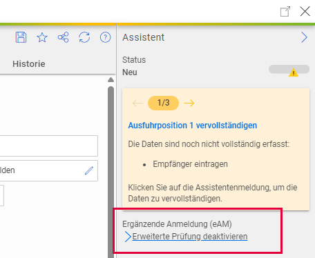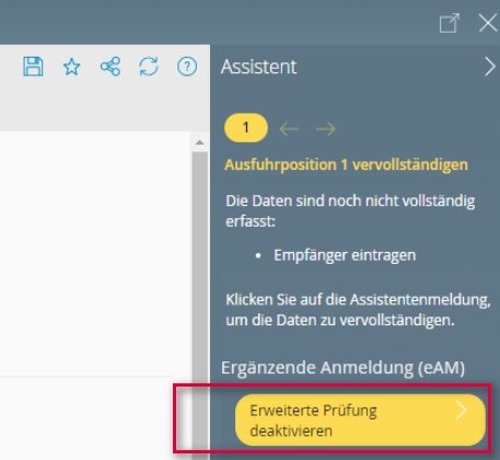 Da der Assistent Sie durch die Erstellung einer ergänzenden Ausfuhranmeldung führt, können Sie bei Bedarf die technischen Feldprüfungen deaktivieren, um eine doppelte Meldung von einzelnen Angaben zu vermeiden. Nutzen Sie in diesen Fällen die Schaltfläche Erweiterte Prüfung deaktivieren:
