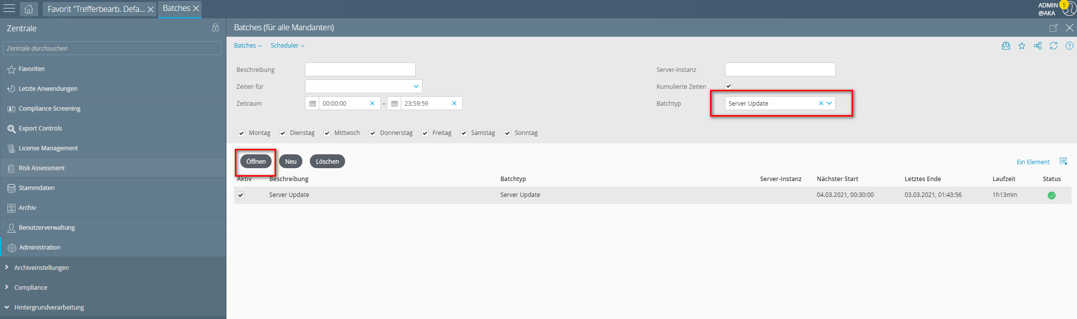 - Unter Administration - Hintergrundverarbeitung - Batches - Batchtyp Server Update finden Sie den Batch der Ihr Servicepaket herunterlädt. Dieser sollte aktiv sein, wie hier gezeigt: