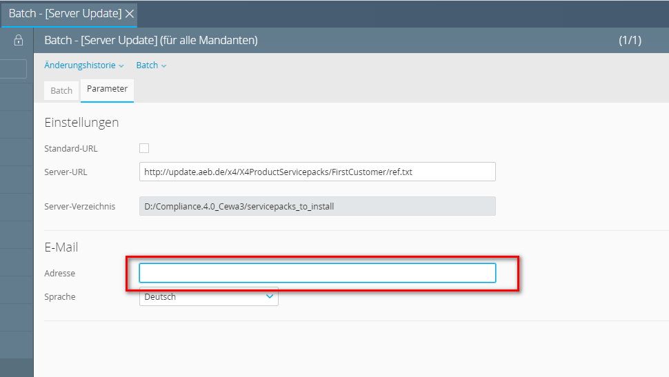 - In der Mappe Parameter finden Sie das Feld Adresse, in das Sie eine oder mehrere E-Mail Adressen hinterlegen können.