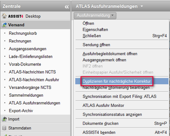 - Markieren Sie die gewünschte Ausfuhranmeldung und wählen Sie im Menü Ausfuhranmeldung die Menüfunktion Duplizieren für nachträgliche Korrektur.