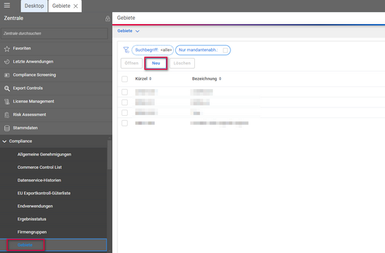 - Voraussetzung für die Pflege der Gebiete und der Aufnahme der Gebiete ins Compliance Profil sind Administratorenrechte mit der Rolle I_COMPLIANCEADMIN.