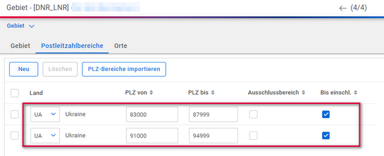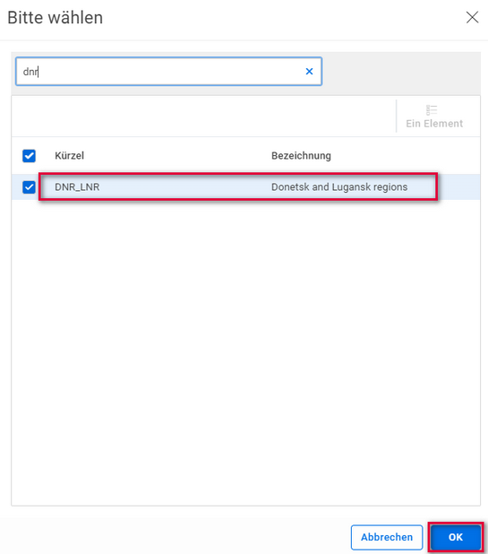 Dort können Sie das neu angelegte Gebiet auswählen. Hier im Beispiel für Donezk und Luhansk mit dem Kürzel DNR_LNR: