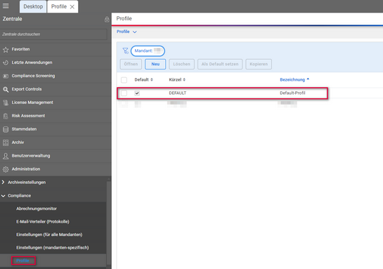 Um das definierte Gebiet in Compliance Screening zu nutzen, öffnen Sie zunächst über den Eintrag Compliance die Profile.