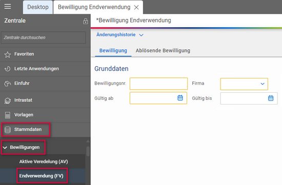 In Import Filing: ATLAS hinterlegen Sie die Bewilligung zur Endverwendung innerhalb der Stammdaten. Öffnen Sie die Bewilligungen, dann gelangen Sie zum Eintrag Endverwendung (FV). Über die Schaltfläche Neu in der Übersicht hinterlegen Sie eine neue Bewilligung.