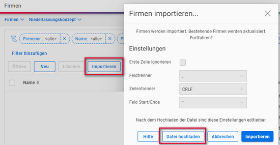Upload über CSV-Datei: Alternativ importieren Sie eine CSV-Datei mit den Angaben zu Ihren Geschäftspartnern. Nutzen Sie dazu in der Übersicht der Firmen die Schaltfläche Importieren. Dann erhalten Sie ein separates Fenster für den Upload.