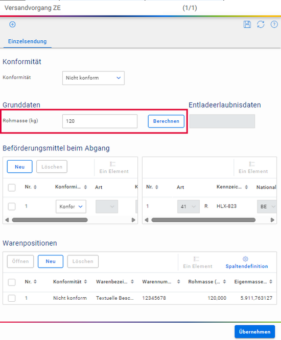 Abschließend muss die Gesamt-Rohmasse aller Positionen in den Grunddaten des Entladekommentars eigetragen oder mittels der Schaltflächen Berechnen neu ermittelt werden.