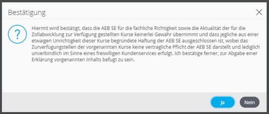 Bestätigen Sie den Hinweis, dass letztendlich immer der Zoll die Hoheit über die Zollkurse hat, jederzeit sich einen Kurs ändern kann und AEB für die globalen Kurse keine Gewähr übernehmen kann. Sollte es zu Abweichungen kommen, gilt immer der vom Zoll festgelegte Kurs: