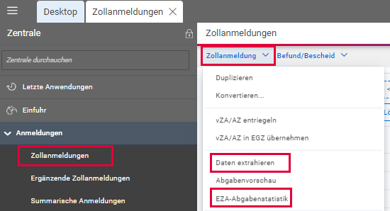 In der Übersicht der Zollanmeldungen haben Sie die Möglichkeit ad hoc Datenextrakte zu erstellen. Wählen Sie über die Filterfelder zunächst den Zeitraum aus, indem Sie diesen z. B. über das Erfassungsdatum oder den Meldemonat die Ergebnisse eingrenzen. Sobald Sie die Vorgänge danach gefiltert haben, verwenden Sie im oberen Menü zur Zollanmeldung den Eintrag Daten extrahieren. Alternativ zu diesen Datenextrakten haben Sie in dem Menü auch die Möglichkeit eine Übersicht Ihrer Abgaben für Einzelzollanmeldungen zu erstellen unter EZA-Abgabenstatistik.