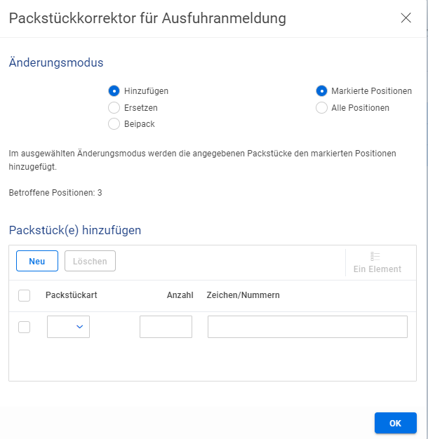 Hier können Sie die Packstücke für eine oder mehrere Positionen innerhalb einer Ausfuhranmeldung gleichzeitig hinzufügen, ersetzen oder als Beipack melden. Auch können neue Packstücke angelegt werden: