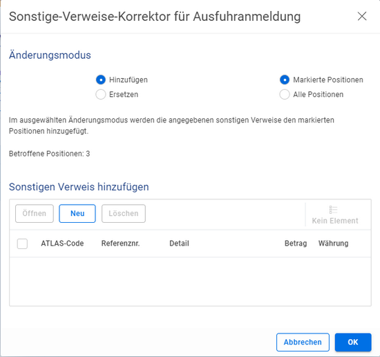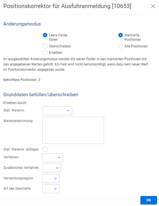 Hier haben Sie die Möglichkeit folgende Angaben bei mehreren Positionen einer Ausfuhranmeldung gleichzeitig zu ändern: