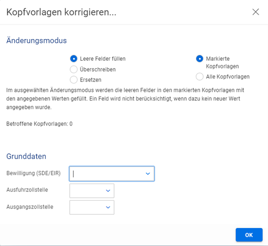 Im Änderungsmodus legen Sie Korrektur- und Auswahlmodus fest. Entscheiden Sie, ob Sie nur in den von Ihnen markierten oder in allen Vorlagen leere Felder füllen, Felder überschreiben oder Einträge ersetzen möchten: