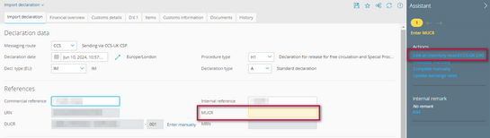 Use the assistant link to select the corresponding record. When clicking on Link an inventory record CCS UK (UK) in the assistant, a pop-up window will appear showing a list of all your unattached inventory records that are available for assigning to an import declaration. Select the required record and the MUCR will then be populated in the declaration once the pop-up window closes.