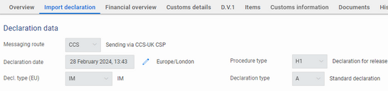 All remaining required data will be dependent on the commodities being processed and needs to be consistent with the CDS requirements for an import declaration. Once the import declaration is complete, you can send it to CDS to be processed as necessary.