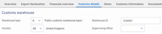 The Customs warehouse information is entered via the Customs details tab of the declaration. Below is an example of how this data element might be completed.
