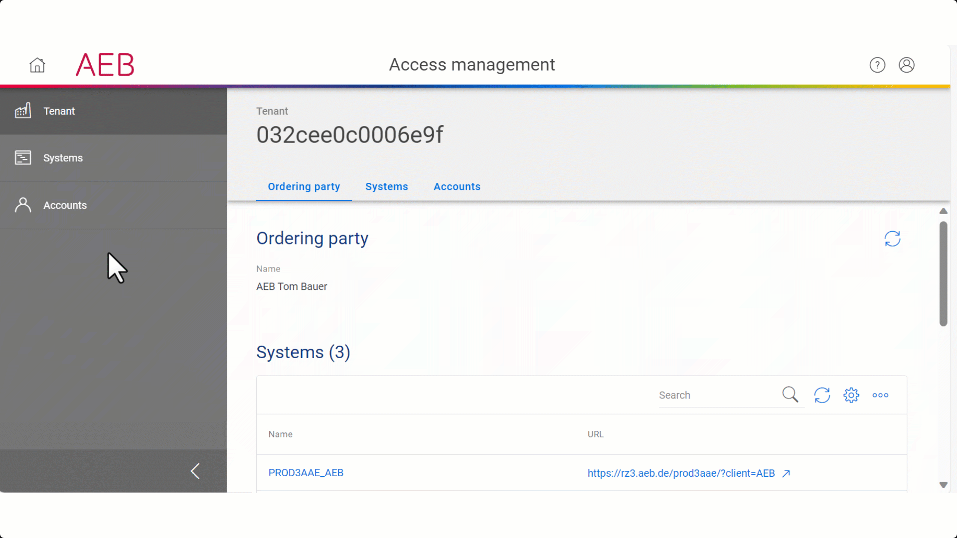 A tenant admin is initially defined for each tenant. The tenant admin role can also be assigned right away when you create a new AEB account or later to an existing AEB account.
