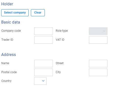 - Enter the Holder information. Use the Select company button to view, and pick from, the companies held in your master data, or type into the relevant fields, and click Save & close.