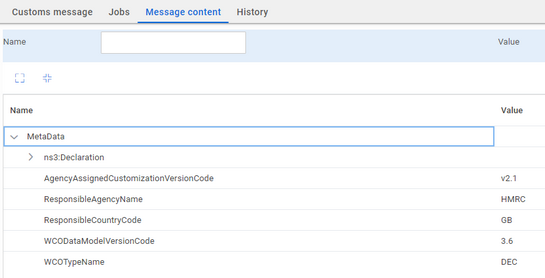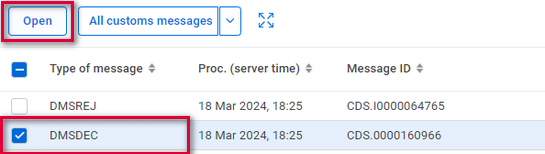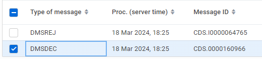 - Select the declaration message that was sent to Customs, which caused the error to be returned. In the example below, the DMSDEC is the declaration message that was sent to CDS just prior to the DMSREJ error message being received.