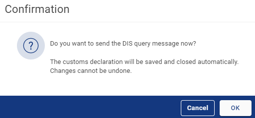 To check if a DIS query has been sent, or if a DIS response has been received, open the declaration again and select the Customs information tab. In the Customs messages section, a DIS query / DIS response message will be shown along with the processing status of the message.