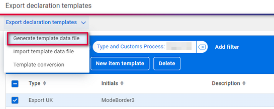 - From the specific declaration type templates menu (in this example: Export declaration templates menu) select Generate template data file.