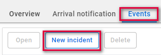 To record an incident on a transit declaration that has occurred en route, go to the Events tab and click the New incident button.