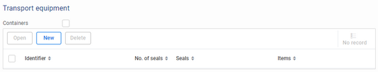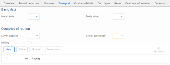 Header level transport information, including transport equipment, is entered via the Transport tab of the transit declaration.