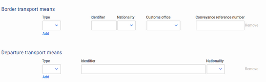 Header level transport information, including transport equipment, is entered via the Transport tab of the transit declaration.