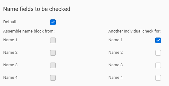 If you carry out checks via a pre-system or use the file check, several name fields can be taken into account during the check. By default, only the name is checked. If you transfer addresses in several name fields, these can be taken into account by specifying how the name block is formed. If the name block created (based on these settings) is empty, the default name block is used. You can also decide whether you want to carry out a further, individual check for one or more name fields. Please note that an additional individual check also means that an additional check transaction is carried out.