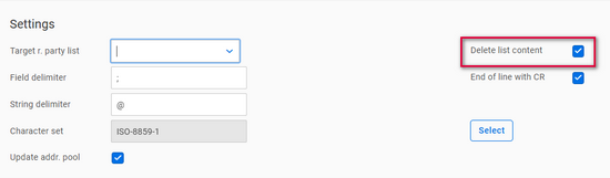 Note: By default, the list contents of the existing manual restricted party list are deleted during data import and replaced by the new data imported. As a result, addresses will not be available until the following day. Deactivate the Delete list content option if you want to add the contents of the manual restricted party list to the existing restricted party list. When de-selecting this setting, make sure that you do not import any duplicates to existing data.