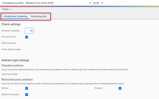 The lists selected under Good Guy lists are taken into account in the address check. The good guy lists are maintained (including whether the check is active and which check profile is used) under Compliance Screening > Good Guy lists.