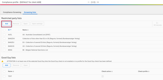 Select the Screening lists tab, and use Add or Remove to determine which restricted party lists are included when performing checks with this profile.