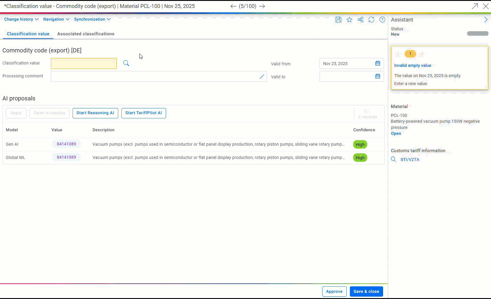 With the February 2026 service pack, you can now benefit from an additional AI model – generative artificial intelligence (reasoning) – and thus optimize your processes even further. The model enables the determination of an AI-based proposal by transferring material data available in the system to generative AI models and subsequent further processing. The main advantage of this is the optimized traceability of the proposed result. In this way, you not only receive an explanation of the general product understanding on which the determination is based, but also a justification of the proposal determined. Justification is provided both in text form and by means of a specified confidence level. In this way, you can quickly and easily evaluate the proposed result and decide for yourself whether you want to accept the proposal or not.