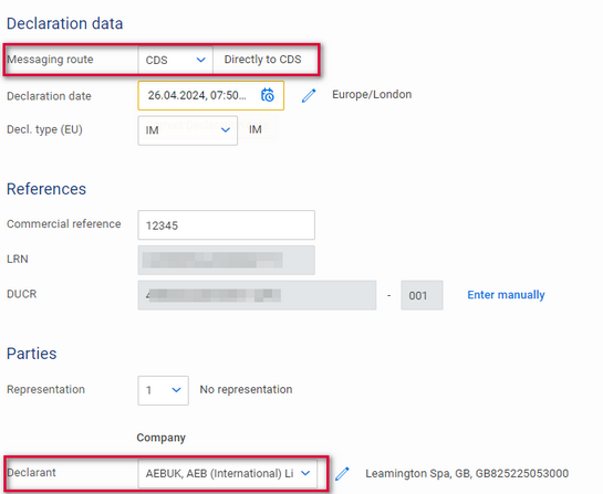 - Check that the messaging route is correct and that it is configured for the declarant that has been selected.