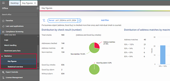 If you operate your Trade Compliance Management solution in the AEB data center, this function is already enabled. Go to Compliance Screening – Statistics – Key figures to open graphical overviews and use filter criteria to define the relevant period as required.