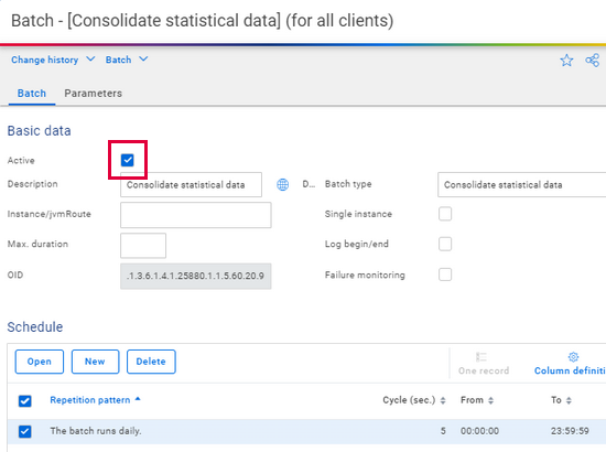 - Enable the batch [Consolidate statistical data] and save the change with Save & close.