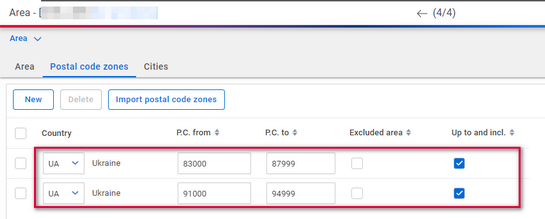 Click New. Enter the area name on the Area sheet and the country code and the postal code zone on the Postal code zones sheet. If necessary, enter a name on the Cities sheet.