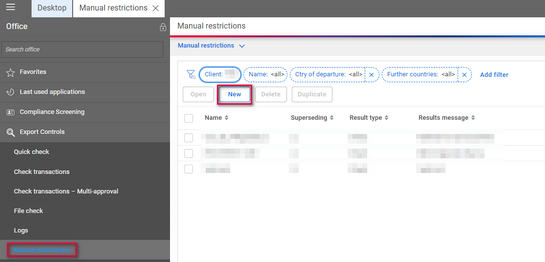 The manual restriction is then added to all relevant compliance profiles in the relevant jurisdictions (e.g. Export Controls EU, Export Controls US-EAR, or in your own additional jurisdictions):