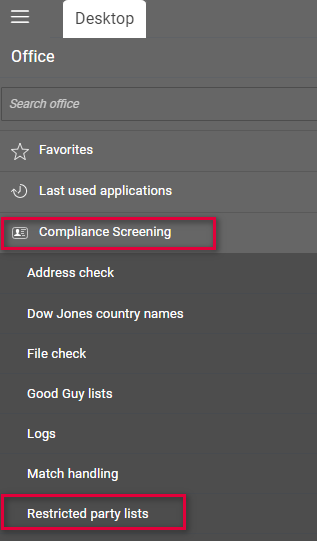 You can get an overview of which restricted party lists you can use within the application under Restricted party lists. From the Office, open Compliance Screening and then click Restricted party lists: