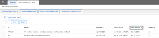 In the overview of the restricted party lists, you can see the date of the last list change by the authority in the Date changed column.