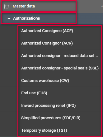 | Customs warehouse (CW) | X | Authorizations: Customs warehouse (CW) | |