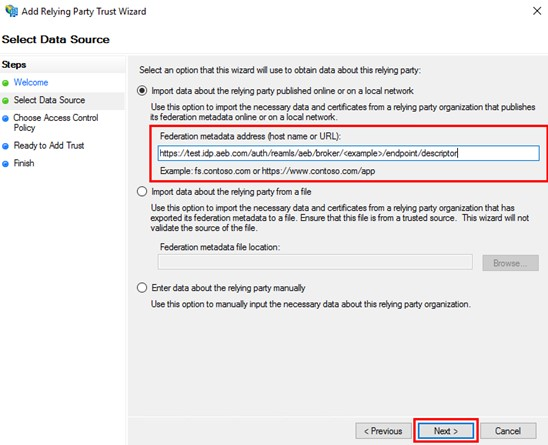 - Enter the Federation metadata address provided by AEB. For example: https://test.idp.aeb.com/auth/realms/aeb/broker/<example>/endpoint/descriptor.