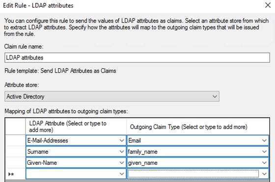 - Enter a name, select the value Active Directory as Attribute store, and create a mapping for the attributes E-Mail Address, Surname and Given-Name.