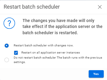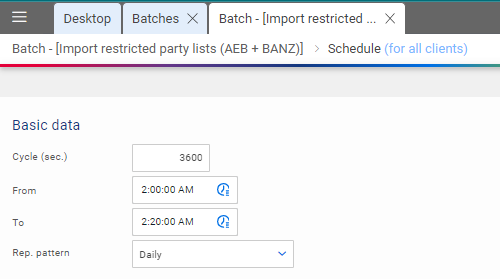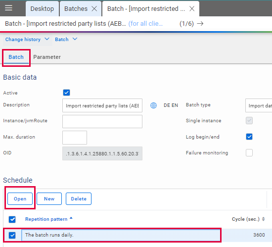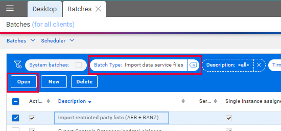 Go to Administration – Background calls – Batches. In the overview, filter by the "Import data service files" batch type. Open the Import restricted party lists (AEB + BANZ) batch.